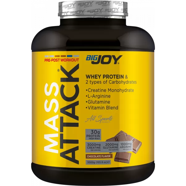 BIGJOY SPORTS® Mass Attack® sporcular için geliştirilmiş yüksek kalitede Whey Protein, 2 tip Karbonhidrat, Kreatin, L-Arginin, L-Glutamin, Taurin ve Vitamin kompleksi içeren BigJoy® ailesinin yeni jenerasyon ürünüdür.